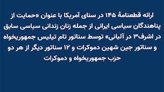 قطعنامه 145 با عنوان "حمایت از پناهندگان سیاسی ایرانی از جمله زنان زندانی سیاسی سابق در اشرف3 در آلبانی" توسط سناتورها تیلیس جمهوریخواه و شهین دمکرات و 12 سناتور دیگر از هر دو حزب در سنای آمریکا ارائه شد. قطعنامه 145 خواستار تضمین تمام حقوق اساسی ساکنان اشرف۳ در چارچوب کنوانسیونهای بینالمللی است. در این قطعنامه همچنین آمده است که بیش از 900 زن و مرد در اشرف3 از زندانیان سیاسی سابق هستند که شاهد جنایات رژیم ایران بوده اند و بسیاری از آنها، از جمله شاهد قتل عام زندانیان سیاسی سال 1367 بوده اند و باید برای شهادتهای احتمالی در دادگاههای بین المللی در مورد قتل عام 67 و سایر نقضهای شدید حقوق بشر در ایران، کاملا محافظت شوند.******